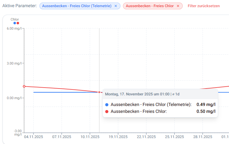 Wenn Sie über eine automatische Witty-Mess- und Regeltechnik mit Witty-COM verfügen und das mein.Schwimmbad-Paket in Silber oder Gold abonniert haben, können Sie hier alle aktuellen Daten sowie die Historie der vier Hygieneparameter – Freies Chlor, pH-Wert, Redoxpotential und Wassertemperatur – für Ihr Schwimmbecken einsehen.