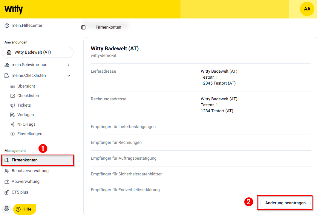 Klicken Sie links in der Menüleiste unter dem Menüpunkt „Management“ auf die Option „Firmenkonto“. Wählen Sie anschließend das gewünschte Firmenkonto aus und klicken Sie auf den Button „Änderungen beantragen“. Fügen Sie die entsprechenden Daten hinzu und bestätigen Sie anschließend.