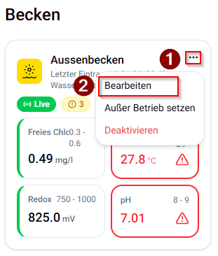 - Klicken Sie bei bei dem Becken, dessen Name geändert werden soll, auf "Bearbeiten".