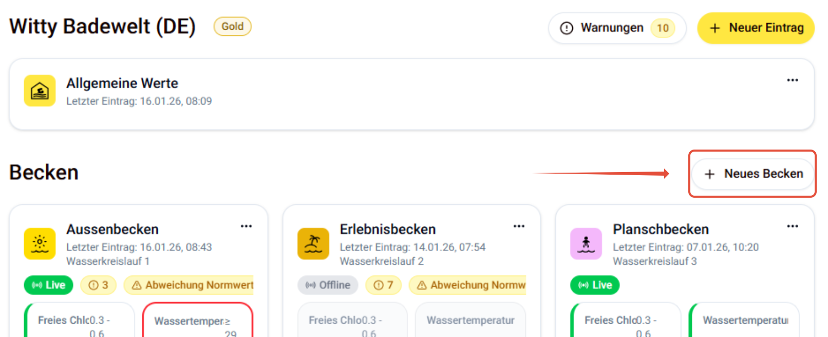 - Klicken Sie auf "Neues Becken". Sollte der Button ausgegraut sein, haben Sie die maximale Becken-Anzahl ihres gebuchten Pakets erreicht.