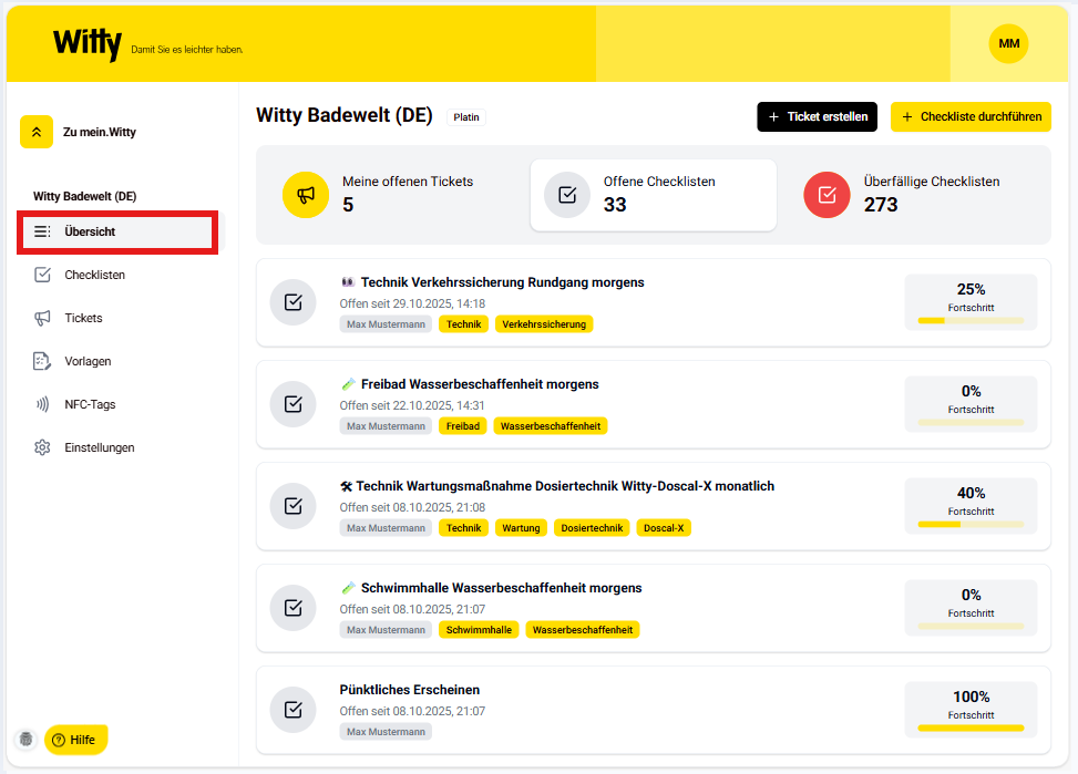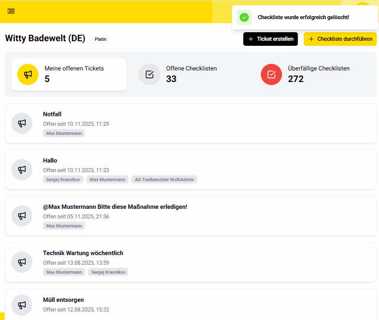 Die Übersichtsseite bietet einen schnellen Überblick über alle offenen Tickets sowie über alle offenen und bereits abgeschlossenen Checklisten.
