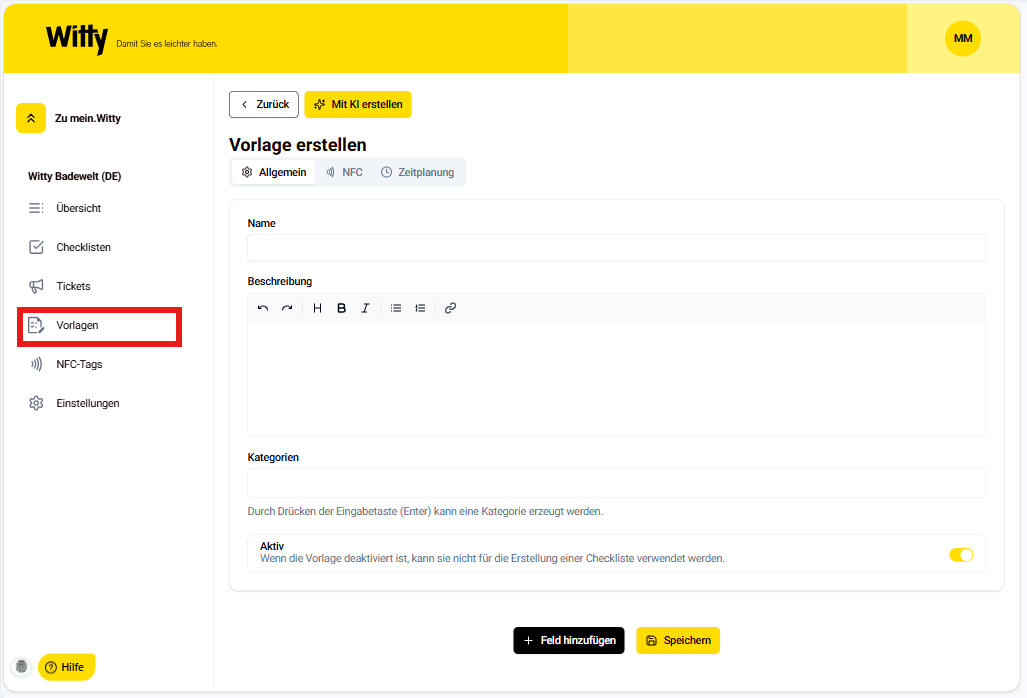 Im Seitenmenü unter dem Punkt "Vorlagen" können einzelne Checklisten definiert werden. Jede Aufgabe kann mithilfe von verschiedenen Auswahlfeldern (Feldtypen) gestaltet werden. Alle weiteren Informationen zu Feldtypen, einschließlich Tipps zur optimalen Gestaltung der Checklisten und Beispiele, finden Sie im Artikel "Was sind Feldtypen und wie werden sie genutzt?"