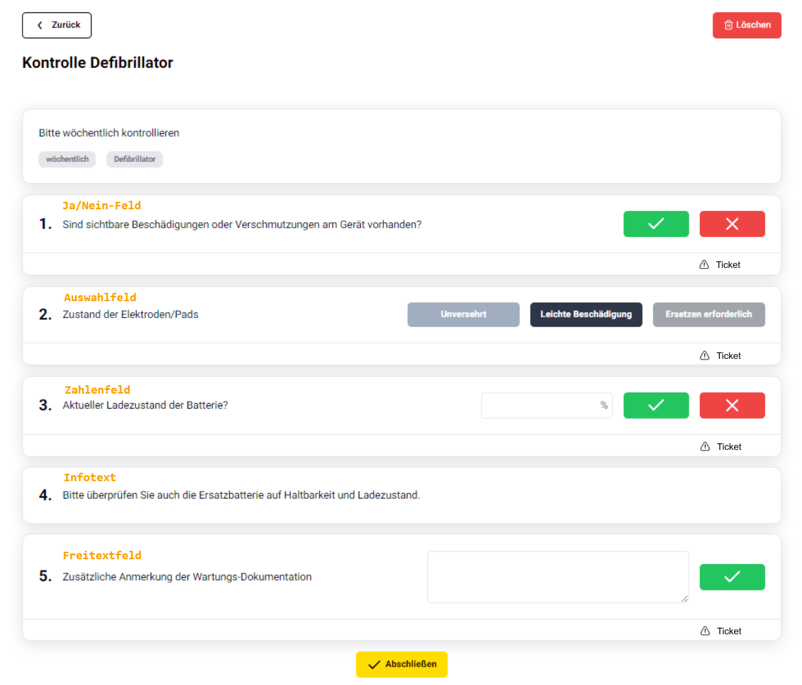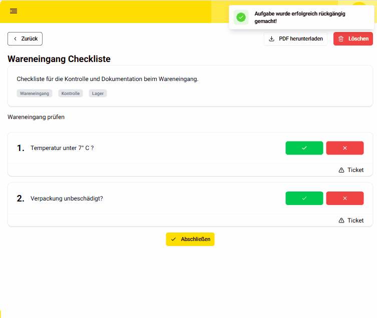 - Tickets, die als Reaktion auf eine nicht erfüllte Aufgabe erstellt werden können. Tickets können auch unabhängig von den Checklisten erzeugt werden (ab Bronze-Paket).