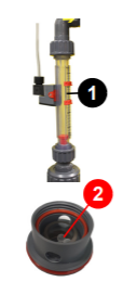 ![]() | Der Messwasserdurchfluss wird an der linken Durchflussarmatur mittels eines Durchflussmessers (1) angezeigt. Für eine einwandfreie Messung der Elektroden ist der Durchfluss auf 45 bis 90 Liter/Stunde einzustellen. Um ein schnelles Verschmutzen der Messelektroden zu vermeiden, muss der Durchfluss mindestens so hoch sein, dass die Reinigungskugeln der Chlorelektrode (2) innerhalb der Reinigungskappe flink „springen“. Wartungshinweis